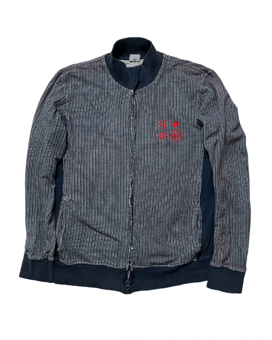 Distressed zip up jacket by PPFM. Blue stripe fabric featuring raw hems with red contrasting embroidery. Small tear in fabric above right pocket as pictured. Fits L